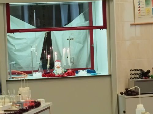 A vendégvárásra az Arany Labor is ünnepi díszekbe öltözött és az általános iskolás diákokkal és pedagógusokkal közösen gyújtottuk meg az adventi koszorú 4. gyertyáját. Bár az időjárás még nem fordult igazán téliesre, igyekeztünk a kémia eszközeivel havat és hideget varázsolni. A vendégvárásra készülve úgy gondoltuk, hogy közelebbről is megvizsgáljuk a hagyományos karácsonyi sütemények: a mézeskalács és a beigli hozzávalóit. Elsőként a sütőport vizsgáltuk meg és derítettük ki, hogy mitől fújja fel már egy kis víz és hő hatására is a süteményeket. Majd rájöttünk, hogy szintén szén-dioxid képződik az élesztő hatására a sütemények szénhidrát tartalmából. Kinyomoztuk a hamisított, liszttel feljavított tejföl rejtélyét, majd cékla-indikátor segítségével megvizsgáltuk a háztartásban található anyagaink kémhatását. A megszerzett tudásunk segítségével pedig karácsonyi üdvözlőkártyát készítettünk a vendégeink számára. A karácsonyi varázslat sem maradhatott ki a sorból: fekete kígyókat növesztettünk és csillagszórót égettünk még víz alatt is. A hangulatos délután végén egy kis terített asztal és némi ajándék is várta a megfáradt kémikusokat.